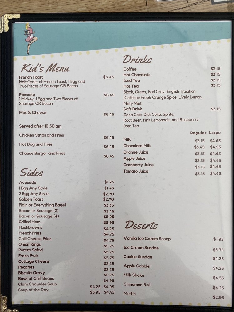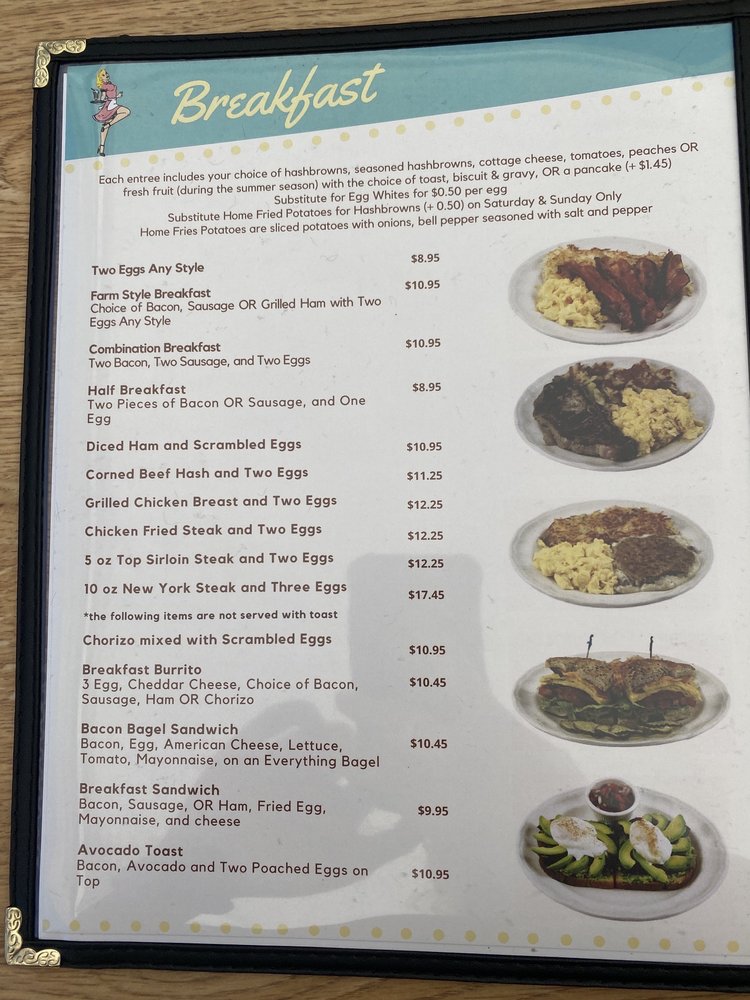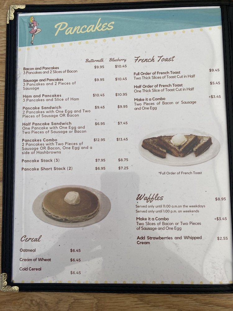 Choice of fried, scrambled, over easy, or sunny side up eggs. Flat sweet cake. Seasoned ground meat that has been wrapped in a casing.